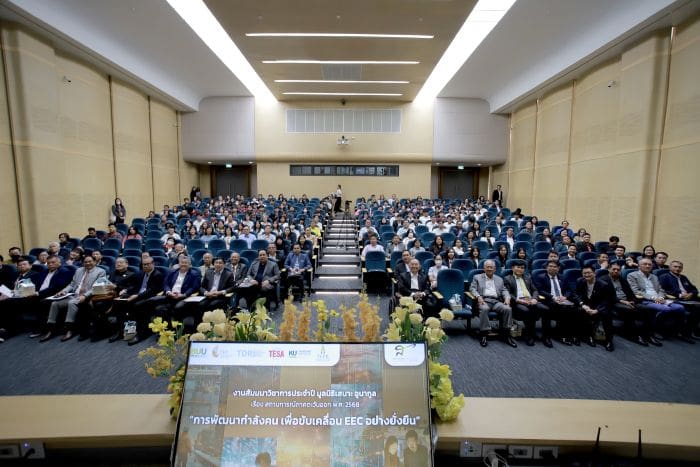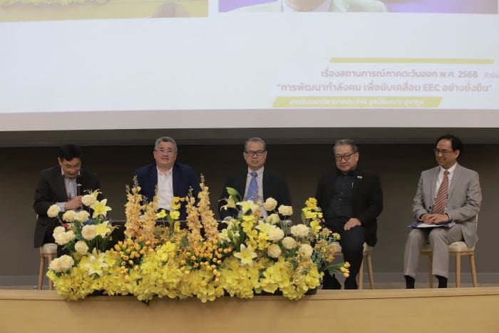 สำนักงานคณะกรรมการนโยบายเขตพัฒนาพิเศษภาคตะวันออก (สกพอ.) หรือ อีอีซีร่วมกับ มูลนิธิเสนาะ อูนากูล มหาวิทยาลัยบูรพา และ สถาบันวิจัยเพื่อการพัฒนาประเทศไทย (TDRI) พร้อมภาคีเครือข่าย จัดงานสัมมนาวิชาการประจำปี เรื่อง สถานการณ์ภาคตะวันออก พ.ศ. 2568 หัวข้อ “การพัฒนากำลังคน เพื่อขับเคลื่อนอีอีซีอย่างยั่งยืน” ณ หอประชุมธํารงบัวศรี มหาวิทยาลัยบูรพา บางแสน จังหวัดชลบุรี โดย ดร.ณรงค์ชัย อัครเศรณี ประธานมูลนิธิเสนาะ อูนากูล เป็นประธานเปิดงานฯ ดร.จุฬา สุขมานพ เลขาธิการ สกพอ. ร่วมปาฐกถาพิเศษ และมีดร.วัชรินทร์ กาสลัก อธิการบดีมหาวิทยาลัยบูรพา กล่าวให้การต้อนรับ ดร.สมเกียรติ ตั้งกิจวานิชย์ ประธาน TDRI เป็นผู้สรุปการเสวนาฯ พร้อมด้วยผู้แทนจากหน่วยงานภาครัฐ – เอกชน นักวิชาการ สื่อมวลชน เข้าร่วมในการสัมมนา