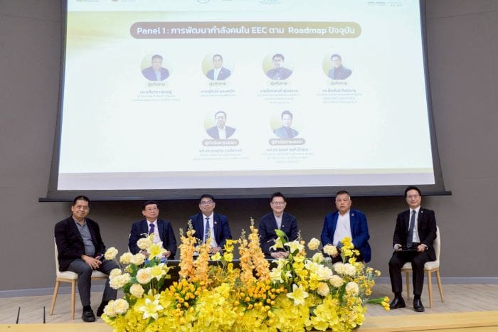 สำหรับงานสัมมนาฯ ครั้งนี้ ได้มีการจัดเวทีอภิปรายเป็น 2 ช่วง เพื่อเจาะลึกและร่วมกันหาแนวทางการพัฒนากำลังคนใน EEC อย่างยั่งยืน โดยช่วงที่ 1 จะเป็นเวทีเสวนา หัวข้อ “การพัฒนากำลังคนใน EEC ตาม EEC Roadmap ปัจจุบัน” โดยมีผู้อภิปราย ได้แก่ ดร.จุฬา สุขมานพ เลขาธิการ อีอีซี ดร.อภิชาติ ทองอยู่ คณะทำงานประสานงาน ด้านการพัฒนาบุคลากรในเขตพัฒนาพิเศษภาคตะวันออก (EEC HDC) นายสุโรจน์ แสงสนิท นายกสมาคมยานยนต์ไฟฟ้าไทย นายจิตรพงษ์ พุ่มสอาด ผู้อำนวยการกลุ่มพัฒนาระบบบริหาร กรมพัฒนาฝีมือแรงงานกระทรวงแรงงาน ดร. สัมพันธ์ ศิลปนาฎ (Business Alliance Development, Delta Electronics) และมี รศ.ดร.ยงยุทธ แฉล้มวงศ์ หัวหน้าคณะวิจัยและที่ปรึกษานโยบายทรัพยากรมนุษย์ TDRI ผศ.ดร.ณยศ คุรุกิจโกศล (คณบดี คณะวิศวกรรมศาสตร์ มหาวิทยาลัยบูรพา เป็นผู้ดำเนินการอภิปราย