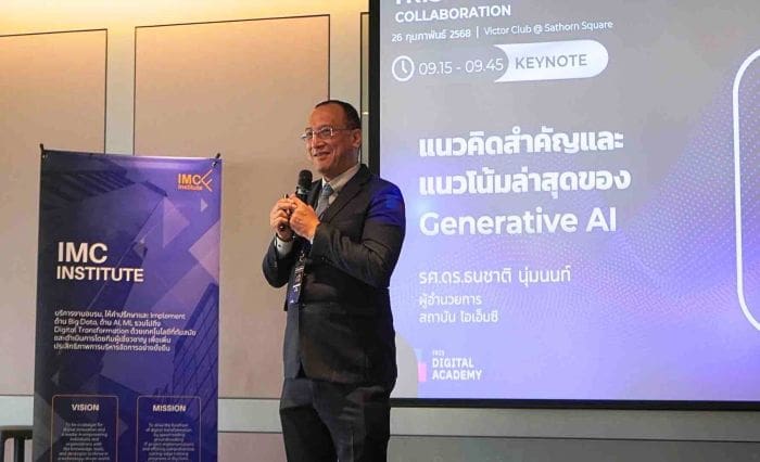 รศ.ดร. ธนชาติ นุ่มนนท์ ผู้อำนวยการสถาบันไอเอ็มซี กล่าวเพิ่มเติมว่า หลักสูตรที่เปิดตัวภายใต้ความร่วมมือนี้ ได้แก่: 1. Generative AI for Smart Work – เรียนรู้เทคนิคการใช้ Generative AI เพื่อเพิ่มประสิทธิภาพการทำงาน หลักสูตรนี้ออกแบบมาเพื่อช่วยพนักงานในองค์กรให้เข้าใจและประยุกต์ใช้ Generative AI ในการเพิ่มประสิทธิภาพการทำงาน โดยมุ่งเน้นการเรียนรู้และใช้งานเครื่องมือ AI ชั้นนำที่สามารถช่วยในงานหลากหลายประเภท ผู้เรียนจะได้ฝึกฝนทักษะผ่าน Workshop ที่ออกแบบมา เพื่อเสริมความเข้าใจและใช้งาน AI ได้อย่างเต็มประสิทธิภาพ โดยได้รับเกียรติจาก รศ.ดร.ธนชาติ นุ่มนนท์ ผู้อำนวยการสถาบันไอเอ็มซี และ อาจารย์ศุภชัย สัจไพบูลย์กิจ ประธานเจ้าหน้าที่บริหาร บริษัท ออพติมุส (ประเทศไทย) จำกัด ร่วมเป็นวิทยากร