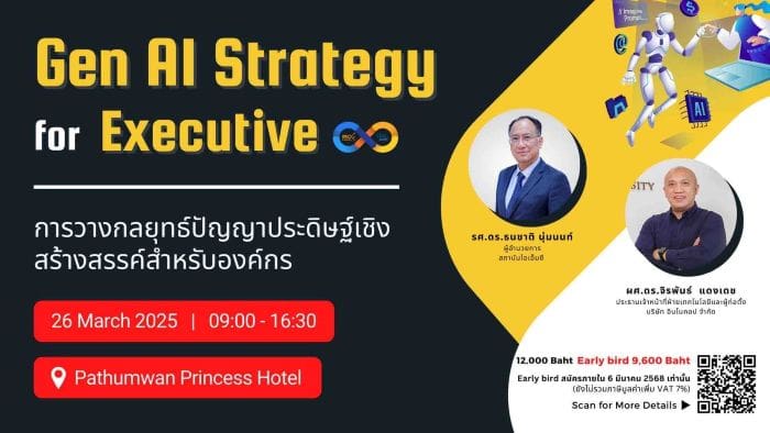 โดยหลักสูตร Gen AI Strategy for Executive – กลยุทธ์การใช้ AI สำหรับผู้บริหารเพื่อขับเคลื่อนองค์กร จัดอบรมทั้งหมด 3 รอบ ได้แก่ วันที่ 26 มีนาคม 2568, วันที่ 11 มิถุนายน 2568 และ วันที่ 9 กันยายน 2568 สถานที่อบรม ณ ห้อง Executive 1+2, Below Lobby Floor โรงแรมปทุมวันปริ๊นเซส (MBK Center)