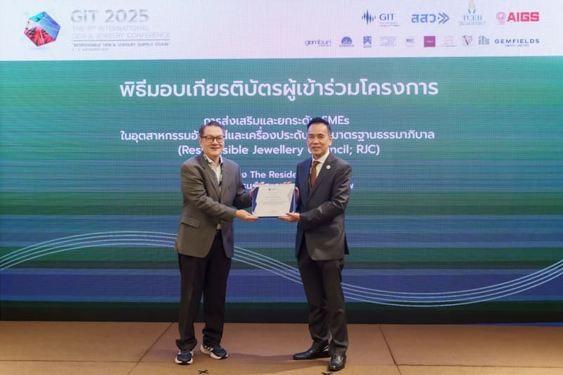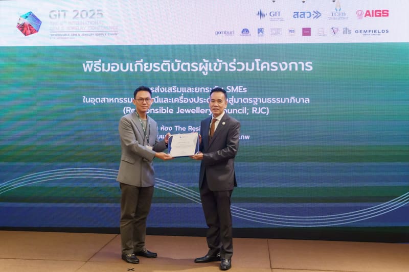 ภายในงานครั้งนี้ นอกจากจะจัดให้มีการสัมมนาในหัวข้อที่น่าสนใจแล้ว ในช่วงบ่ายของวันนี้ (8 ก.ย. 68) ยังจัดให้มีพิธีมอบเกียรติบัตรผู้เข้าร่วมโครงการ “การส่งเสริมและยกระดับ SMEs ในอุตสาหกรรมอัญมณีและเครื่องประดับเข้าสู่มาตรฐานธรรมาภิบาล (Responsible Jewellery Council; RJC)” และพิธีมอบใบรับรองการขึ้นทะเบียนห้องปฏิบัติการมาตรฐาน GIT Standard ณ ห้อง The Residence ชั้น M โดยได้รับเกียรติจาก นายสุเมธ ประสงค์พงษ์ชัย ผู้อำนวยการสถาบันวิจัยและพัฒนาอัญมณีและเครื่องประดับแห่งชาติ เป็นประธานในพิธี ซึ่งรางวัลที่ได้รับนี้ ถือเป็นใบประกาศเกียรติคุณและกำลังใจสำคัญที่จะเตือนย้ำให้ทุกองค์กรมีความมุ่งมั่นพัฒนา โดยตั้งอยู่บนมาตรฐานธรรมาภิบาล เพื่อธุรกิจจะเติบโตอย่างยั่งยืนต่อไป และยกระดับมาตรฐานห้องปฏิบัติการให้เทียบเท่าสากล
