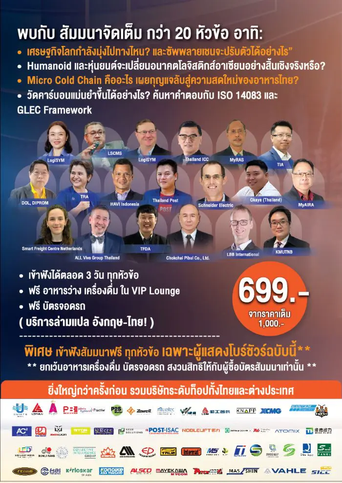 ห้ามพลาด! “LogiMAT – LogiSYM Thailand 2025” เวทีสัมมนาระดับนานาชาติ ที่จะพาคุณและธุรกิจของคุณก้าวข้ามขีดจำกัดเดิม ๆ สู่การเปลี่ยนผ่านด้านโลจิสติกส์และซัพพลายเชนในยุคดิจิทัล โดยผู้เชี่ยวชาญระดับโลกพร้อมบริการล่ามแปลภาษาอังกฤษ-ไทยแบบเรียลไทม์ จองที่นั่งราคาพิเศษวันนี้! เพียง 699 บาท (ปกติ 1,000 บาท) รับสิทธิพิเศษ อาทิ การเข้าร่วมสัมมนาได้ตลอดทั้ง 3 วันทุกหัวข้อ พร้อมที่จอดรถ และอาหารว่าง-เครื่องดื่ม ใน VIP Lounge ฟรี! ได้ที่ https://www.logimat-sea.com/logimat-logisym-thailand-2025 และอัปเดตข่าวสารที่ www.logimat-sea.com