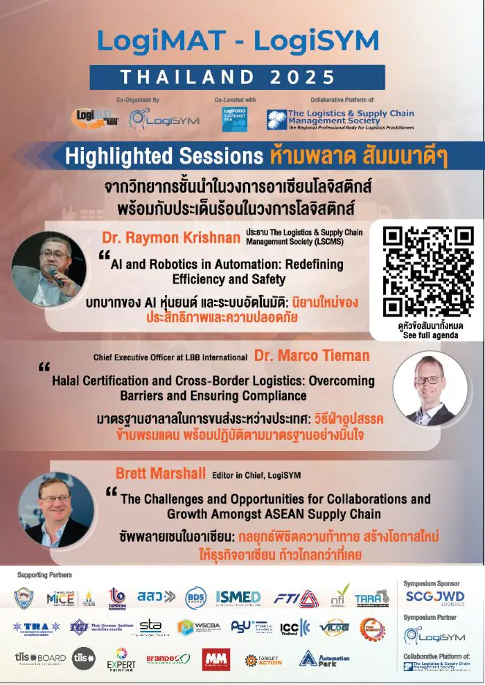 Highlight Sessions จากวิทยากรชั้นนำ อาทิ Dr. Raymon Krishnan, President, Logistics & Supply Chain Management Society (Southeast Asia Market) ในหัวข้อ “บทบาทของ AI หุ่นยนต์ และระบบอัตโนมัติ: นิยามใหม่ของประสิทธิภาพและความปลอดภัย”, Dr. Marco Tieman CEO จาก LBB International หัวข้อ “มาตรฐานฮาลาลในการขนส่งระหว่างประเทศ: วิธีฝ่าอุปสรรคข้ามพรมแดน พร้อมปฏิบัติตามมาตรฐานอย่างมั่นใจ” และ Brett Marshall บรรณาธิการ LogiSYM ในหัวข้อ “ซัพพลายเชนในอาเซียน: กลยุทธ์พิชิตความท้าทาย สร้างโอกาสใหม่ให้ธุรกิจอาเซียนก้าวไกลกว่าที่เคย”