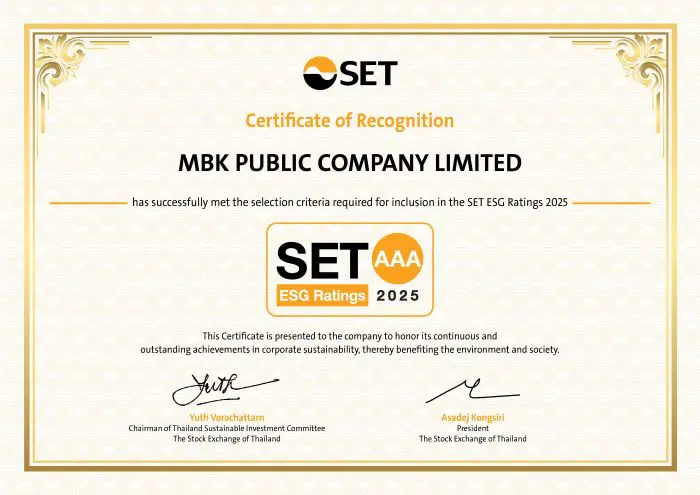 บริษัท เอ็ม บี เค จำกัด (มหาชน) กลุ่มบริษัทชั้นนำของประเทศที่เติบโตอย่างมั่นคง มุ่งมั่นในการลงทุนและประกอบธุรกิจที่ให้ผลตอบแทนอย่างยั่งยืน ได้รับการประเมินหุ้นยั่งยืน SET ESG Ratings 2025 ระดับ AAA ซึ่งเป็นระดับสูงสุด โดยได้รับการคัดเลือกเป็นหุ้นยั่งยืนต่อเนื่องเป็นปีที่ 2 ติดต่อกัน ในประเภทกลุ่มอุตสาหกรรมบริษัท อสังหาริมทรัพย์และก่อสร้าง จาก ตลาดหลักทรัพย์แห่งประเทศไทย ตอกย้ำให้เห็นถึงการยกระดับถึงความมุ่งมั่นในการดำเนินธุรกิจตามหลักการกำกับดูแลกิจการที่ดี มีหลักธรรมาภิบาล มีความโปร่งใส ควบคู่ไปกับการดำเนินธุรกิจให้เติบโตอย่างยั่งยืน ภายใต้กรอบ ESG ครอบคลุมในทุกมิติ ตลอดจนรักษาระดับผลประกอบการให้เติบโตอย่างสม่ำเสมอ เพื่อสร้างความเชื่อมั่นให้แก่ผู้มีส่วนได้เสียทุกภาคส่วน