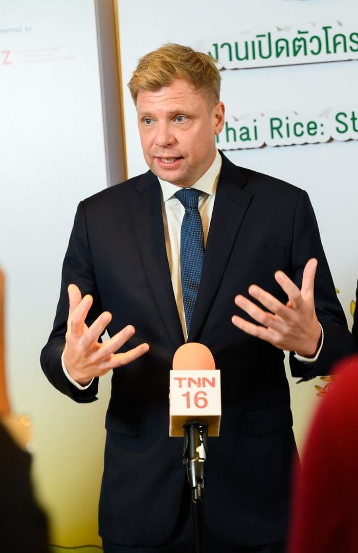 ดร.ทีโม เมนนิเคน ผู้อำนวยการ GIZ ประจำประเทศไทย กล่าวว่า “ความร่วมมือกับหน่วยงานภาคีทั้งในประเทศไทยและต่างประเทศ จะทำให้วิถีการปลูกข้าวที่เท่าทันต่อภูมิอากาศได้รับการยอมรับ และนำมาใช้เป็นแนวทางปฏิบัติหลักของภาคการปลูกข้าว เพื่อเพิ่มรายได้ให้ เกษตรกร ควบคู่ไปกับการป้องกันภาวะโลกร้อนในอนาคตต่อไป”