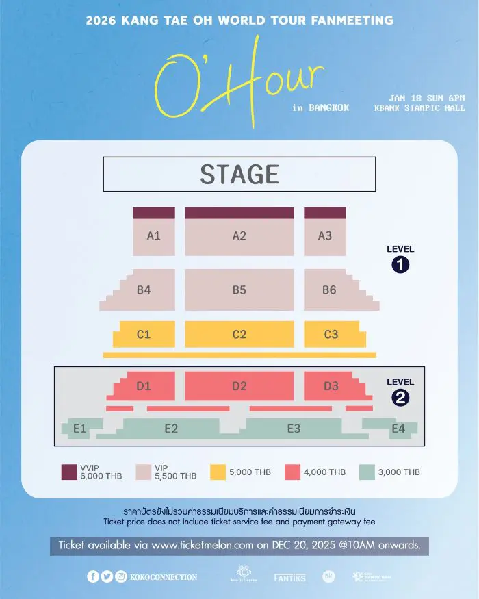 กดบัตรพร้อมกัน ในวันเสาร์ที่ 20 ธันวาคม 2568 เวลา 10.00 น. ผ่านทาง WWW.TICKETMELON.COM บัตรราคา 6,000/ 5,500/ 5,000/ 4,000 และ 3,000 บาท ที่มาพร้อมสิทธิพิเศษ ได้เข้าร่วมกิจกรรม Hi-bye กับหนุ่ม “คัง แทโอ” ทุกที่นั่ง แล้วมาสบตาเสพย์ความหล่อละมุนพร้อมรอยยิ้มละลายใจของ “คัง แทโอ” ไปด้วยกัน