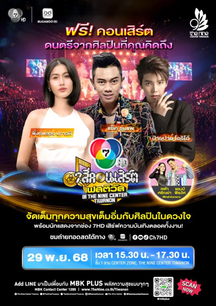 ห้ามพลาด! สนุกอย่างเต็มอิ่มกับศิลปินที่คิดถึง ที่งาน 7 สีคอนเสิร์ตเฟสติวัล @THE NINE CENTER TIWANON ในวันเสาร์ที่ 29 พฤศจิกายน 2568 ณ ชั้น 1 ลานเซ็นเตอร์โซน ศูนย์การค้าเดอะไนน์ เซ็นเตอร์ ติวานนท์ ชมฟรี ไม่มีค่าใช้จ่าย! โดยเปิดประตูให้เข้าชมตั้งแต่เวลา 14.00 น. เป็นต้นไป คอนเสิร์ตจะเริ่มในเวลา 15.30 น. – 17.30 น. และขอความร่วมมือจากผู้ร่วมงานทุกท่าน โปรดแต่งกายด้วย สีขาว-สีดำ หรือสีโทนสุภาพ เพื่อน้อมรำลึกในพระมหากรุณาธิคุณอันหาที่สุดมิได้ สมเด็จพระนางเจ้าสิริกิติ์ พระบรมราชินีนาถ พระบรมราชชนนีพันปีหลวง