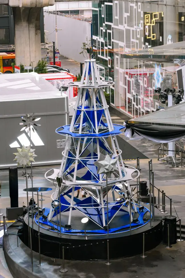 ต้นคริสต์มาสอัพไซเคิล “Kinetic Kaleido Christmas Tree” ดีไซน์ในคอนเซ็ปท์ The Cosmic Origami of Light โอริกามิแสงแห่งจักรวาลที่ถ่ายทอดความงดงามของศิลปะและเทคโนโลยีเข้าด้วยกัน ที่รังสรรค์ขึ้นจากโมดูลรูปทรงโอริกามิซ้อนต่อกันอย่างประณีต โครงสร้างสีเงินเมทัลลิก ส่องประกายด้วยเส้นแสง LED ไล่เฉดนีออนแบบกราเดียนต์ เผยลวดลายเรขาคณิตคล้ายภาพคาไลโดสโคปที่เคลื่อนไหวตามแรงลมอย่างมีชีวิต ก่อให้เกิดการเคลื่อนไหวที่สวยงามในทุกมุมมอง ผู้ชมสามารถเดินชมรอบต้นคริสต์มาสได้แบบ 360 องศา เพื่อสัมผัสประสบการณ์แห่งแสง สี และการเคลื่อนไหวอันดื่มด่ำราวกับหลุดเข้าไปในอวกาศของแสงแห่งศิลปะ