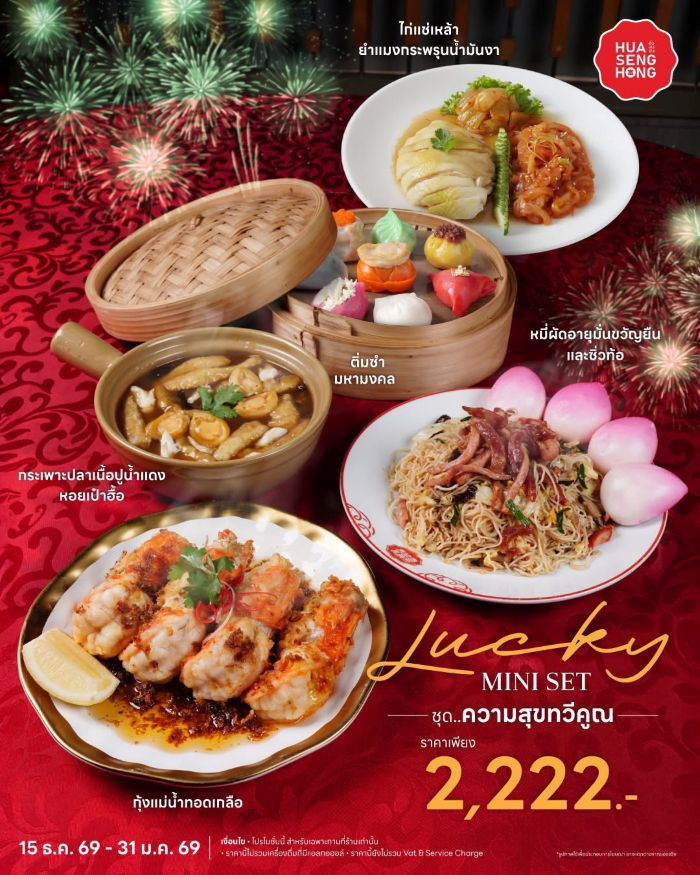 อาหารชุดมงคล 2,222 บาท “Lucky Mini Set ชุดแห่งความสุขทวีคูณ” พร้อมให้คุณมาพิสูจน์ความอร่อยที่ร้านอาหารจีน ฮั่วเซ่งฮง (Hua Seng Hong) วันนี้ – 31 ม.ค. 2569 ที่ฮั่วเซ่งฮง สาขาที่ร่วมรายการ (เยาวราชและเจริญกรุงไม่ร่วมรายการ)