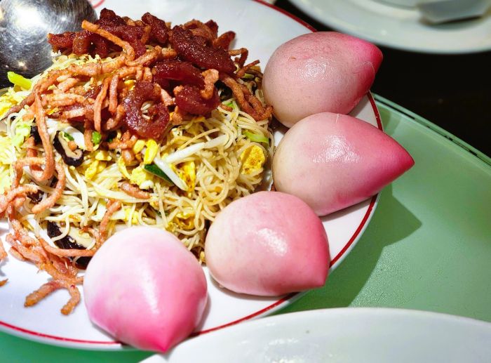 ผัดหมี่อายุมั่นขวัญยืนและซิ่วท้อ… ผัดหมี่เครื่องแน่นกุ้ง แฮม โดยเส้นหมี่แทนเส้นทางชีวิตที่ต่อเนื่อง อวยพรให้การค้าขายรุ่งเรือง การงานราบรื่น ในขณะที่ ซิ่วท้อ โหลเห่ โหลเห่ โหลเห่ สีสันสวยงาม สอดไส้ครีม หอมอร่อย