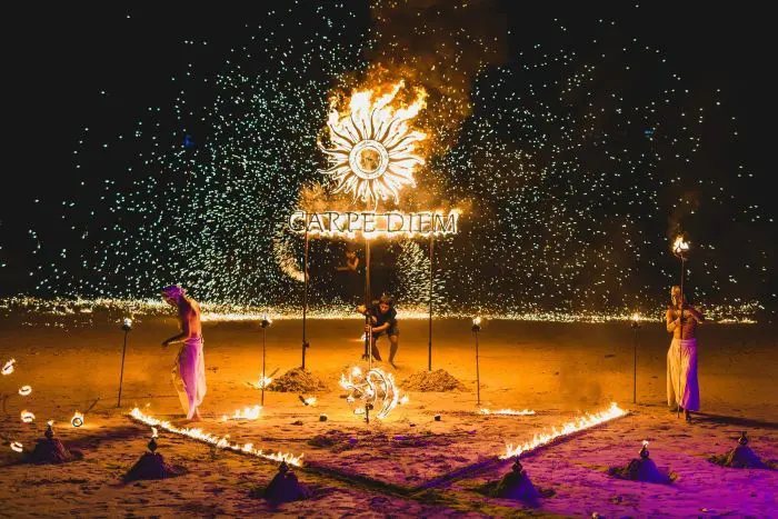 โซนเตียงริมสระของ Carpe Diem มอบบริการครบครัน ทั้งพนักงานดูแล ผ้าเย็น และเมนูเครื่องดื่มคัดสรรตั้งแต่ค็อกเทล ไวน์ แชมเปญ ไปจนถึงสปิริตพรีเมียม อีกทั้งยังมีดีเจประจำคลับที่ช่วยสร้างบรรยากาศผ่อนคลายในช่วงกลางวัน และต่อเนื่องด้วยจังหวะเร้าใจในยามเย็นจนถึงค่ำ ขณะที่ชายหาดเต็มไปด้วยการแสดงสุดตระการตา ปิดท้ายด้วยโชว์ควงไฟสุดอลังการริมทะเล