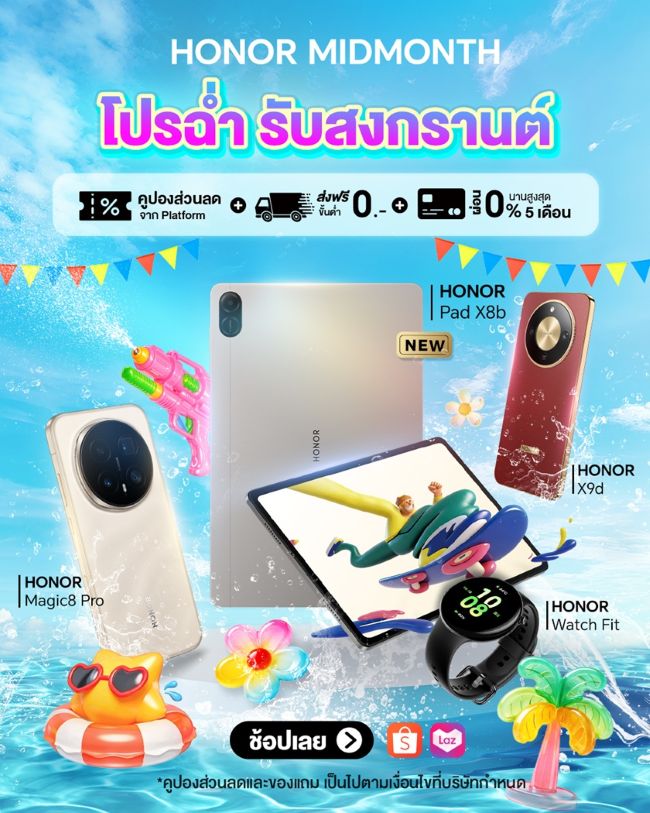สำหรับแคมเปญ ‘HONOR MIDMONTH โปรฉ่ำ รับสงกรานต์’ นักช้อปสามารถเลือกซื้อสินค้าที่ชอบในราคาที่ใช่ผ่านช่องทางออนไลน์ชั้นนำ พร้อมรับสิทธิพิเศษมากมาย ไม่ว่าจะเป็น Shopee ที่ให้ส่วนลดสูงสุดถึง 46% พร้อมโค้ดลดเพิ่มสูงสุด 10,000 บาท (เฉพาะวันที่ 15 เม.ย. 69) คลิกเลย https://url.in.th/nBNXL และ Lazada ลดสูงสุด 46% พร้อมโค้ดลดเพิ่มสูงสุด 3,000 บาท (วันที่ 15 – 17 เม.ย. 69) คลิกเลย https://url.in.th/OEKRa โดยมีโปรโมชั่นพิเศษ ส่งฟรีไม่มีขั้นต่ำทุกออเดอร์ และสิทธิผ่อนชำระ 0% นานสูงสุด 5 เดือนผ่าน SPayLater หรือ LazPayLater รวมถึงผ่อน 0% นานสูงสุด 10 เดือน ผ่านบัตรเครดิตที่ร่วมรายการ