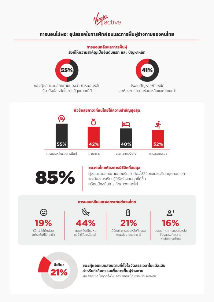 ผลสำรวจยังชี้ให้เห็นว่าปัญหาการนอนเป็นเรื่องปกติที่พบได้ทั่วไป โดยมีผู้ตอบแบบสอบถามน้อยกว่า 1 ใน 5 (19%) เท่านั้นที่ระบุว่าตนเองรู้สึกพักผ่อนได้เต็มที่ทุกเช้า ขณะที่กว่า 1 ใน 3 (37%) ยอมรับว่าปัญหาการนอนส่งผลกระทบอย่างมีนัยสำคัญต่อพลังงานและความสามารถในการมีสมาธิในแต่ละวัน แม้จะมีความตระหนักถึงปัญหาดังกล่าว แต่กลับมีเพียง 21% ของผู้ตอบแบบสอบถามเท่านั้น ที่ตั้งใจจัดสรรเวลาสำหรับการฟื้นฟูร่างกายและจิตใจในแต่ละวัน เช่น การทำสมาธิ การคลายกล้ามเนื้อด้วยการใช้โฟมโรลเลอร์ หรือการมีวันหยุดพักผ่อน