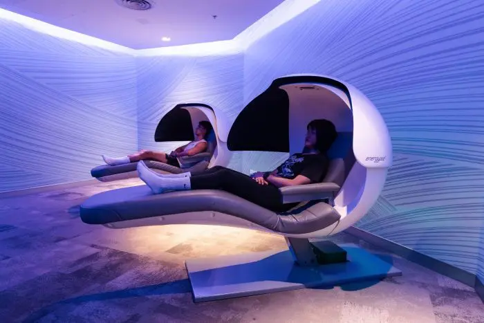 · Sleep Pods เทคโนโลยีไร้แรงโน้มถ่วง พร้อมเสียงบรรยากาศและแรงสั่นเบา ๆ เพื่อสนับสนุนการงีบหลับ ช่วยให้สมาชิกสามารถชาร์จพลังได้อย่างรวดเร็ว