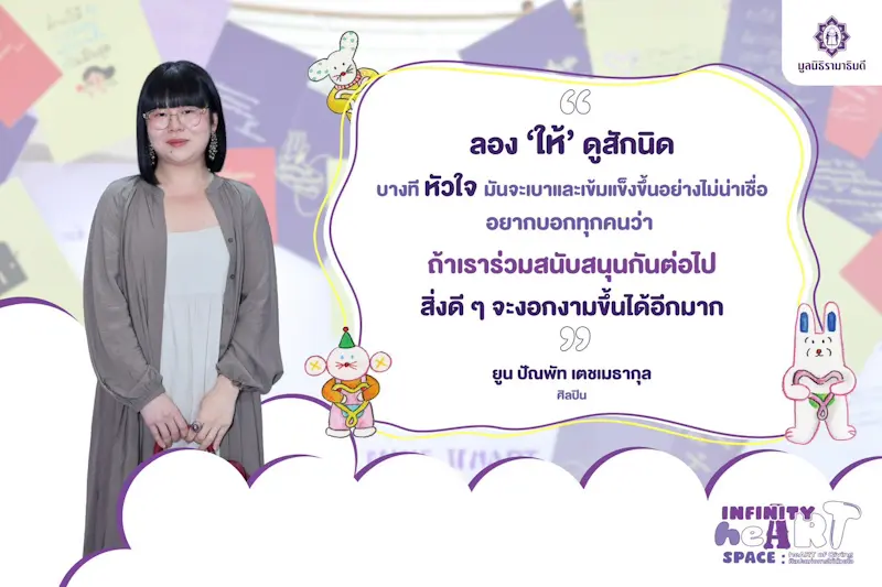 “ของที่ระลึกจึงไม่ใช่เพียงสิ่งของหนึ่งชิ้น แต่คือ ‘สื่อกลางของหัวใจ’ ที่เชื่อมโยงหัวใจของผู้คน และพลังบวกจากผู้ให้ไปถึงผู้รับอย่างงดงาม ซึ่งเป็นที่มาของคอนเซ็ปต์ ‘Infinity heART Space’ ของงานในครั้งนี้ เราหวังว่านิทรรศการนี้จะเป็นแรงบันดาลใจให้ทุกคนได้เห็นว่า ‘การให้‘ คือพลังสร้างสรรค์ที่งดงาม และเป็นคุณค่าทางใจที่ไม่สิ้นสุด เพื่อร่วมกันสร้างฐานของการให้ที่แข็งแรงและยั่งยืนต่อไป”