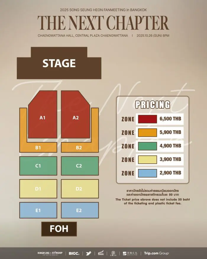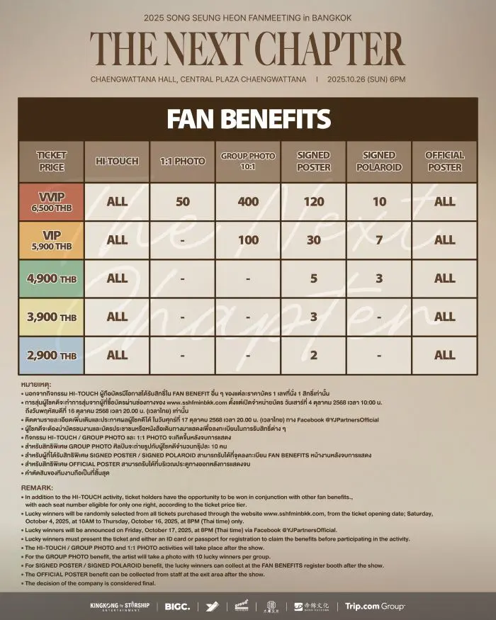 The promoter, YJ PARTNERS, has confirmed that the event will be filled with special activities and exclusive performances prepared especially for Thai fans—ensuring that the evening of October 26 will be a night to remember.Tickets are now on sale via https://www.sshfminbkk.com with prices at 6,500 THB (VVIP) / 5,900 THB (VIP) / 4,900 THB / 3,900 THB / 2,900 THB. Every ticket category includes the exclusive benefit of Hi-Touch with Song Seung Heon! For all fans who have been missing their “Oppa,” this is an opportunity you cannot miss to be up close and create cherished memories together. Stay tuned for more updates on FB / IG / X: @YJPARTNERS.