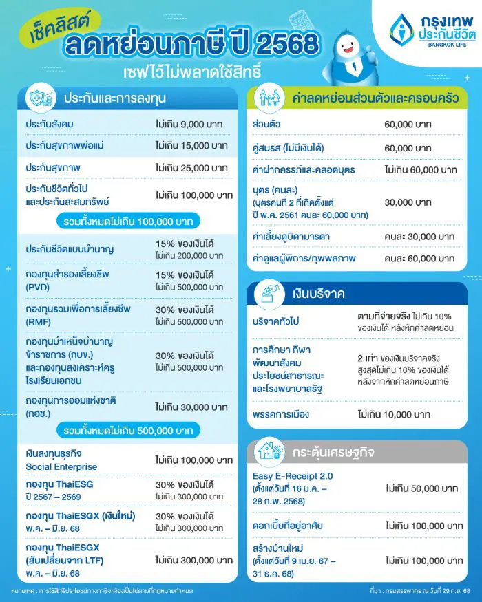 - กองทุนรวม Thai ESGX (สับเปลี่ยนจาก LTF) เดือนพ.ค. – มิ.ย. 2568 : ลดหย่อนได้สูงสุด 30% ของเงินได้ ไม่เกิน 300,000 บาท