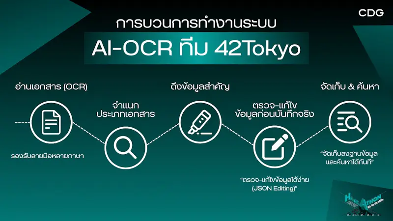 กลุ่มบริษัทซีดีจี ผนึก 42 Bangkok และเครือข่ายทั่วเอเชีย จัด Hackathon 2025 ดึงคนรุ่นใหม่สายเทคพัฒนาโซลูชัน AI จัดการเอกสารภาครัฐอย่างเป็นระบบ ทีม Kaetai 42Tokyo จากญี่ปุ่น คว้าชัยด้วยแนวคิดที่เริ่มจากการจัดเตรียมข้อมูล (Data Labeling) ให้ AI เรียนรู้จากข้อมูลจริง และพิสูจน์ผลลัพธ์ได้ทันทีผ่านการอ่านลายมือ ผสานจุดเด่นด้านการใช้งานจริงทันที่ด้วยหน้าจอแบบ Ready-to-Use ที่เข้าใจง่าย พร้อมจำแนกเอกสารได้หลายภาษา ปกปิดข้อมูลส่วนบุคคลอัตโนมัติตามมาตรฐาน PDPA สะท้อนบทบาทคนรุ่นใหม่ในการผลักดันอนาคต Smart Governance ของไทย