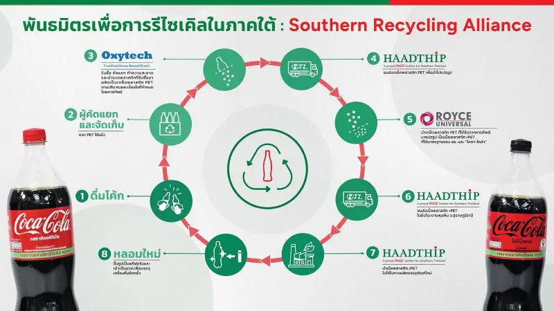 “พันธมิตรเพื่อการรีไซเคิลในภาคใต้” หรือ “Southern Recycling Alliance” ถือเป็นความร่วมมือแบบไตรภาคีที่มุ่งมั่นขับเคลื่อนการรีไซเคิลบรรจุภัณฑ์พลาสติก PET จากขวดสู่ขวด หรือ Bottle-to-Bottle Recycling ในโครงการเดียว ด้วยการนำระบบโลจิสติกส์ย้อนกลับมาใช้ โดยเริ่มจากที่ อ๊อกซิเทค ทำหน้าที่รับซื้อขวดพลาสติก PET จากผู้เก็บและผู้รับซื้อในท้องถิ่นของภาคใต้ นำมาคัดแยกล้างทำความสะอาดและบดเป็นเกล็ดพลาสติก PET (PET Flake) ตามคำสั่งซื้อและข้อกำหนดจากหาดทิพย์ จากนั้น หาดทิพย์จะขนส่งเกล็ดพลาสติก PET ใช้แล้วเหล่านี้ไปผลิตเป็นเม็ดพลาสติก rPET ที่โรงงานของ รอยซ์ ยูนิเวอร์แซล ในจังหวัดนครปฐม ซึ่งได้คุณภาพและมาตรฐานความปลอดภัยทั้งของสำนักงานคณะกรรมการอาหารและยา (อย.) และ “โคคา-โคล่า” โดยเมื่อได้เม็ดพลาสติก rPET แล้ว หาดทิพย์จะนำกลับมาผลิตเป็นขวดเครื่องดื่มใหม่ ณ โรงงานพุนพิน จังหวัดสุราษฏร์ธานี เพื่อส่งมอบผลิตภัณฑ์เครื่องดื่มที่สดชื่นและปลอดภัยถึงมือผู้บริโภคอีกครั้ง ซึ่งทั้งหมดถือเป็นกระบวนการรีไซเคิลจากขวด PET สู่ขวด rPET ที่ครบถ้วนในวงจรเดียวโดยความร่วมมือของสามบริษัทพันธมิตร