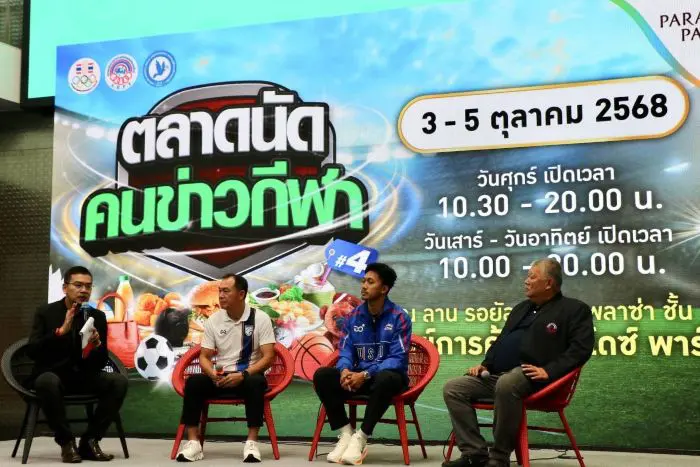 มาช้อปชิมสินค้าคุณภาพ ใกล้ชิดคนข่าวและนักกีฬาทีมชาติไทยที่หมุนเวียนสลับกันมาร่วมงาน ในงาน “ตลาดนัดคนข่าวกีฬา ปีที่ 4” ตั้งแต่วันนี้ – วันอาทิตย์ที่ 5 ตุลาคม 2568 เวลา 10.00 น. – 20.00 ณ ลานรอยัล พาร์ค พลาซ่า ชั้น 1 ศูนย์การค้าพาราไดซ์ พาร์ค