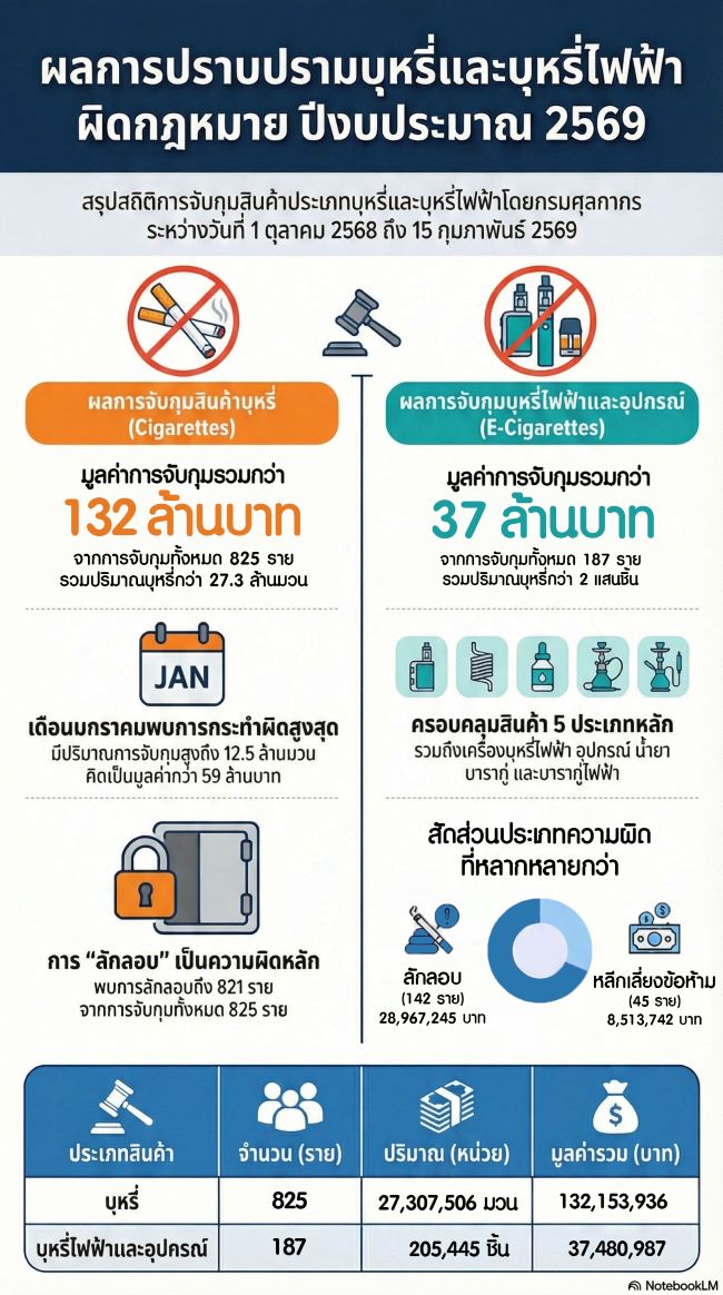 นายพันธ์ทอง ลอยกุลนันท์ อธิบดีกรมศุลกากร เปิดเผยว่า การดำเนินงานดังกล่าวเป็นไปตามนโยบายรัฐบาลในการปราบปรามสินค้าผิดกฎหมาย โดยได้สั่งการให้ทุกหน่วยงานบูรณาการความร่วมมือกับหน่วยงานที่เกี่ยวข้องอย่างใกล้ชิด พร้อมเพิ่มความเข้มงวดในการปราบปรามสินค้าผิดกฎหมาย โดยเฉพาะอย่างยิ่งบุหรี่ต่างประเทศและบุหรี่ไฟฟ้า ซึ่งตั้งแต่เดือนตุลาคม 2568 ถึงวันที่ 15 กุมภาพันธ์ 2569 สามารถจับกุมบุหรี่ต่างประเทศรวมกว่า 27.3 ล้านมวน และบุหรี่ไฟฟ้าพร้อมอุปกรณ์กว่า 205,445 ชิ้น คิดเป็นมูลค่ารวม 169,634,923 บาท ซึ่งพฤติการณ์ส่วนใหญ่จะเป็นการลักลอบนำเข้าผ่านทางพัสดุไปรษณีย์ บริษัทขนส่งเอกชน และซุกซ่อนมาในยานพาหนะที่ใช้ในการขนส่ง