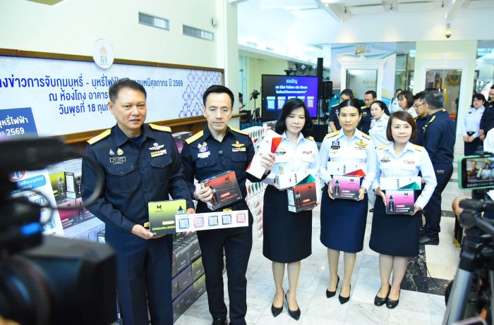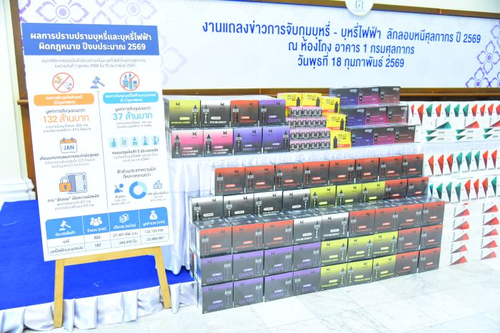 วันนี้ (18 กุมภาพันธ์ 2569) เวลา 13.30 น. นายพันธ์ทอง ลอยกุลนันท์ อธิบดีกรมศุลกากร พร้อมด้วย ผู้บริหารกรมศุลกากร แถลงข่าวการจับกุมบุหรี่ – บุหรี่ไฟฟ้า ลักลอบนำเข้า มูลค่ากว่า 169 ล้านบาท ณ อาคาร 1 ชั้น 1 กรมศุลกากร