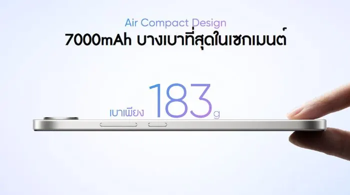มอบความโดดเด่นที่แตกต่างด้วยการออกแบบ Air Design ทำให้ตัวเครื่องบางเพียง 8.1 มม. น้ำหนักเบา 183 กรัม พร้อมดีไซน์ฝาหลังแบบ Aurora Wings ที่เล่นแสง-เปลี่ยนสีไปตามมุมมอง สร้างเอฟเฟกต์ราวกับแสงเหนือที่พลิ้วไหว ดึงดูดทุกคู่สายตา ด้านหน้าใช้จอแสดงผลขนาด 6.57 นิ้ว ขอบล่างบางเฉียบเพียง 2.23 มม. ให้ประสบการณ์ด้านภาพที่สวยงามเต็มตา พร้อมสัมผัสการจับถืออย่างสบายมือในทุกวัน