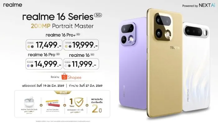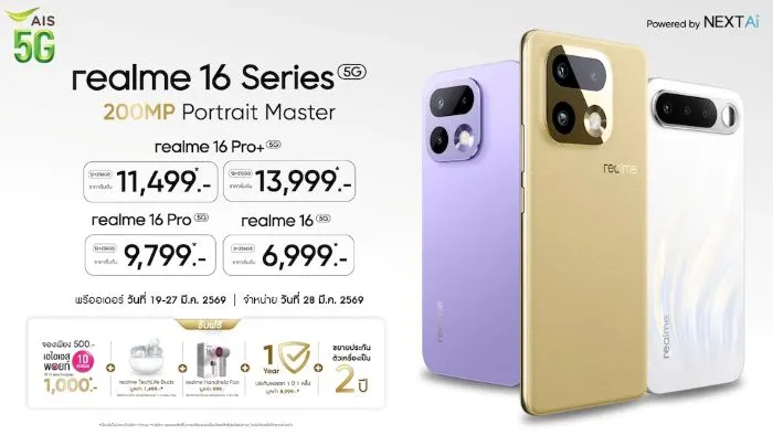 - realme 16 Pro 5G ความจุ 12/256GB ราคาเริ่มต้น 9,799 บาท